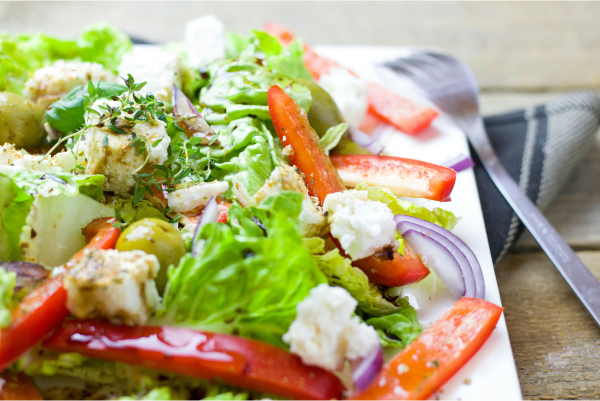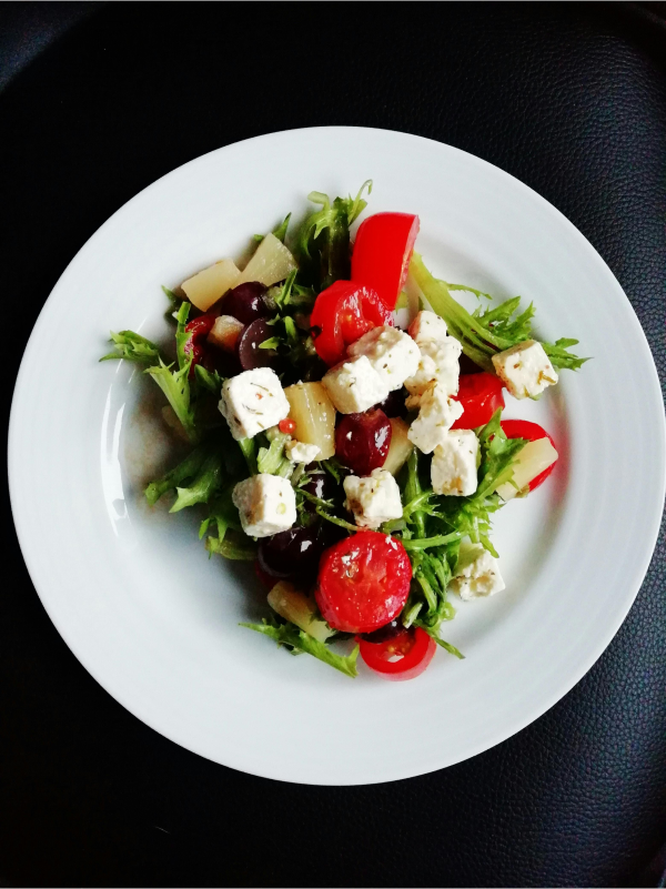Lunch: En sallad med grönsaker, quinoa och kyckling eller tofu.